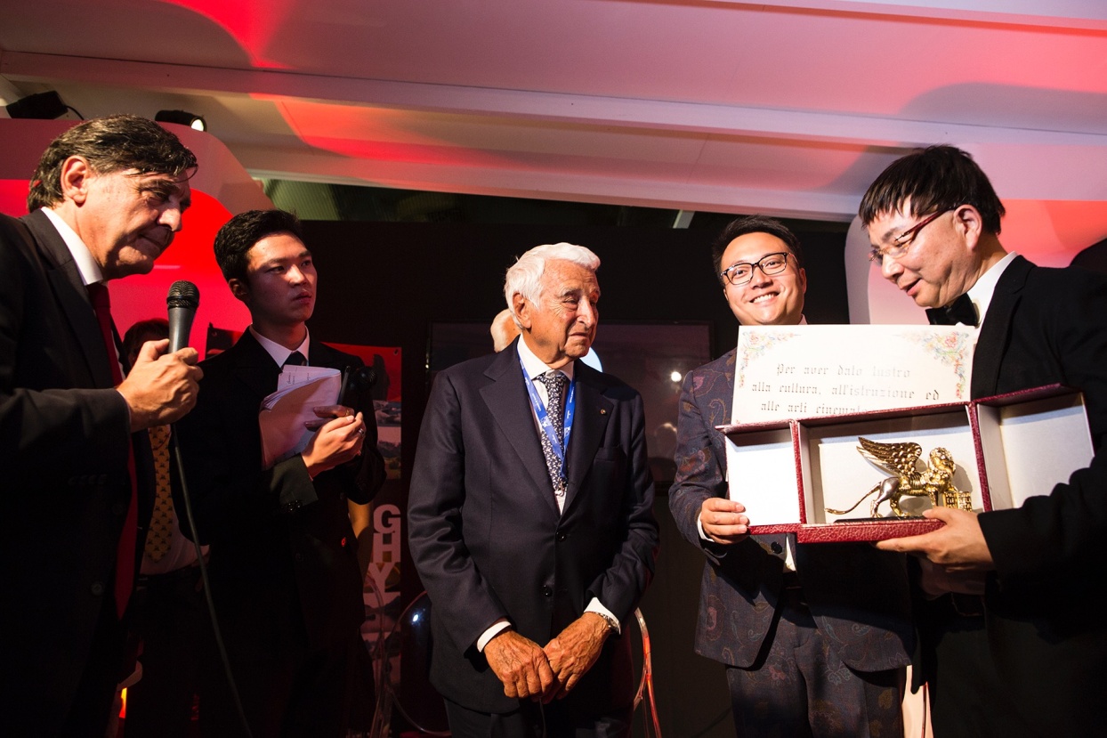 (意大利国际电影制片公司、Lucisano 传媒集团董事、ANICA 前任主席、制片人联合会前任主席 Fulvio Lucisano先生为江泊院长颁发金狮奖“特别贡献奖”。)