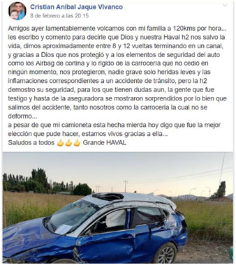 回忆起侧翻事故,克里斯蒂安仍心有余悸。他告诉记者:当地时间2月8日,他驾驶爱车哈弗H2以120km/h的速度(当地法律允许的速度)载着家人结束度假回家,途径智利南部一段高速路上一个弯道处,突然遇到障碍物,他不得不紧急转向,慌乱中导致车辆失控,车辆至少翻滚8周,跌入了路旁的沟里停止了翻滚。在发生事故的第*时间,车辆安全气囊全部打开,最大程度减少了对车内成员的伤害。几乎没有变形的车身令他惊叹不已,充分维持住了车内乘员的安全空间。整车的安全品质超乎想象。